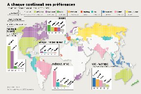Esto sin embargo solamente cuenta un pedazo de la historia. En la gráfica siguiente vemos como se distribuye en el mundo el uso de los diferentes SNS. Como verán genuinamente hay favoritos nacionales. La gráfica esta en francés pero es sumamente comprensible. Denle click para verla en grande: