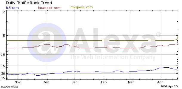 Un detalle curioso: si revisan los datos de tráfico, verán que solo Hi5 tiene estadísticas a nivel global. Si comparamos esos números con los de Facebook y MySpace veremos algo interesante.