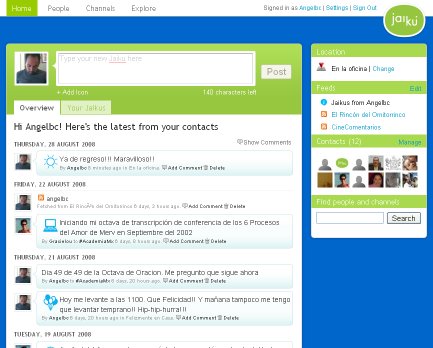 UPDATE: Ha sido hecho de mi atencion el hecho de que con esto de los cambios, el formato de paginas de Jaiku ha cambiado y parece ser que los perfiles personales solo pueden ser vistos si ya estas registrado, con lo que no va a poder ver mi pagina personal 😦 Sugiero que usen el FriendFeed.