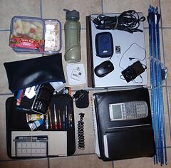 En Flickr hay un pool de fotos llamado «What’s in my bag?«.  En ella la gente pone una foto de los contenidos de su bolsa o backpack. Sobra decir que la mayoria de las que contribuyen son mujeres, pero hay una buena cantidad de backpacks de varones.