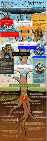Estoy seguro que muchos han oído hablar al menos del Twitter, si no es que ya lo usan, cosa que espero. Si no, vayan acá para saber mas. El punto de esto es que en un sitio llamado Manolith, sacaron una imagen bastante divertida que describe la historia y evolución del Twitter hasta hoy. Esta es la imagen en cuestión, pero aparte de verla toda, quisiera que se concentraran en la raíz, de hecho, en el primer, primer punto donde empieza esto: