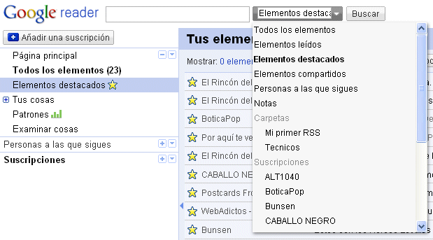 Un detalle interesante de los Elementos Destacados es que Google Reader permite mostrarlos por separado y hacer búsquedas sobre ellos, lo cual puede simplificar mucho el hallar un artículo en particular.