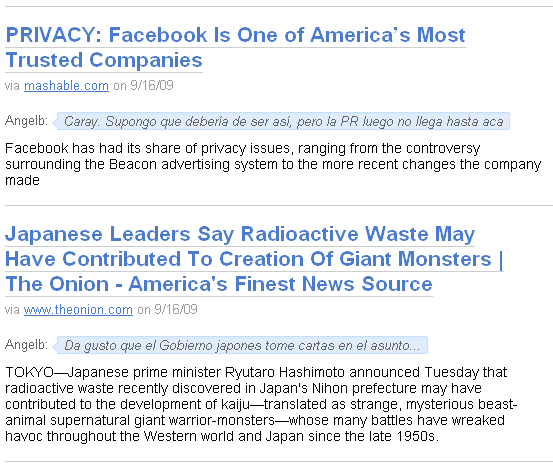Una de las funciones mas subestimadas del Google Reader es la posibilidad de compartir artículos con otras personas. En lo personal me parece que es la segunda función mas importante que puede tener, aparte de su razón de ser que es la de concentrar y organizar nuestros feeds RSS.