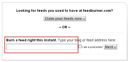 Paso 3 – Vete a Feedburner. Este es un servicio para manejar feeds de RSS. Es parte de Google así que con tu cuenta de Google debes de poder entrar sin apuros. Si no tienes una, crea una cuenta primero. Tras ingresar a Feedburner vas a ver lo siguiente:![]()