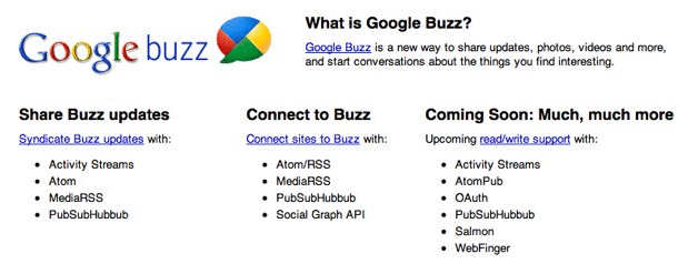 Pero hay detalles mucho menos obvios pero mas significativos, como por ejemplo que Buzz está basado en estándares completamente abiertos. Lo cual significa que mas que una aplicación Google está preparando el camino para todo un ecosistema, tal y como Twitter opera hoy dia con todas las aplicaciones aledañas que complementan y agrandan el servicio. Esto es totalmente contrario a la filosofía de Facebook, por ejemplo.