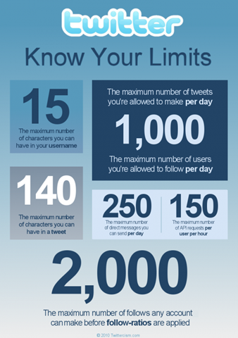 Todas las cosas tienen un límite, por grande que sea. Y Twitter no es la excepción. Si bien es poco probable que alguna vez lo alcancemos, si existe un límite a la cantidad de updates, DMs y otros aspectos que podemos llevar a cabo dentro del servicio. Los caballeros de Twittercism hicieron algo de tarea y pusieron algunos de los límites mas elementales pero menos conocidos de Twitter. Vean nada mas: