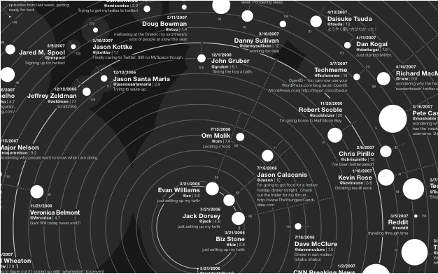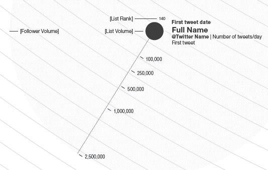 El mapa está organizado de manera que los fundadores de Twitter, están mas al centro. Los círculos blancos representan la cantidad de listas en las que están incluidos y los círculos grises el número de seguidores. También están la fecha de ingreso y el promedio diario de Tweets. De primera instancia no está muy claro como interpretar la información, pero aqui está la clave que explica todo: