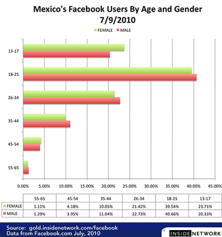 Sin embargo, por impresionante que sean estos números hace falta mas detalle para poder valorar con claridad este fenómeno. Precisamente la semana pasada el sitio Inside Facebook, publicó las siguientes estadísticas respecto a los usuarios mexicanos las cuales revelan a mayor detalle quienes son los que usan esta plataforma.