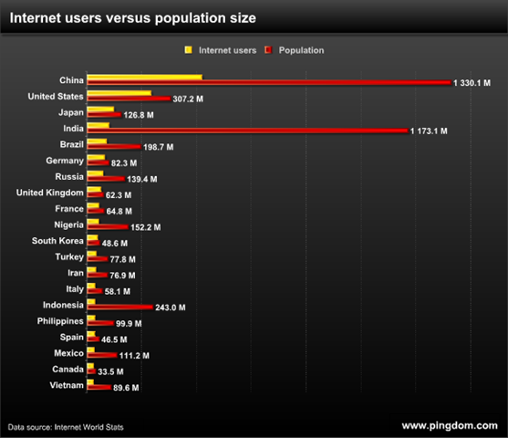 Hay mucho espacio hacia donde crecer. China e India son las dos grandes regiones todavía sin explotar de Internet y es de esperarse que mucho del desarrollo futuro de la Red dependa de lo que suceda ahí. Hay muchos otros países que tienen que desarrollarse en los próximos años y el nuestro es uno de ellos. Noten que solo Brasil y México representan a Latinoamérica en esta estadística.