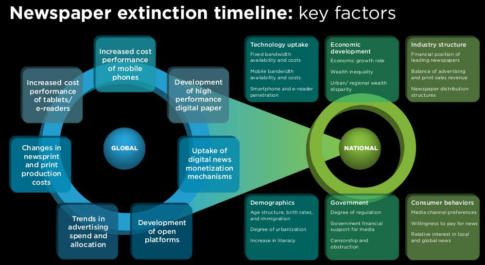 Como verán el final no será ni instantáneo ni uniforme. Habrá lugares donde los periódicos de papel subsistirán casi hasta la mitad de este siglo, mientras que en otros en menos de una década habrán desaparecido. De igual manera señala que el proceso será mas rápido en las áreas metropolitanas importantes mientras que en la periferia es factible que estas publicaciones sobrevivan de manera local por mas tiempo.