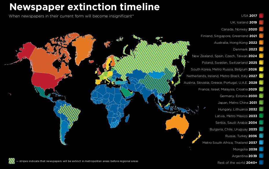 Para ilustrar esto, Ross Dawson, un autor y futurista australiano, publicó en su blog esta infografía donde se describen las posibles fechas en las cuales los periódicos se extinguirán en los diferentes países del mundo.