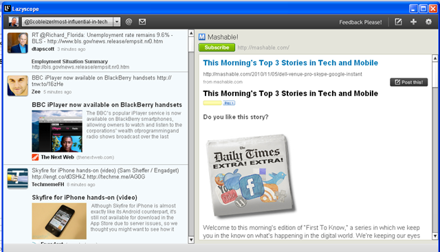 Creado por los mismos desarrolladores que nos dieron Lazyfeed, una muy interesante actualización de un lector RSS que uso y que me ha sido de cierta utilidad, Lazyscope es una herramienta que permite consumir y compartir información principalmente en Twitter de manera sencilla y completa.