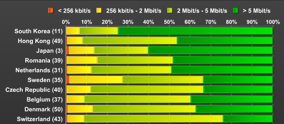 Esta es la manera en la que están distribuidas las velocidades en los diferentes paises. En México casi no hay conexiones de menos de 256 kbits, pero tampoco mayores a 5 Mbit/s. Casi todo está concentrado en el segmento entre 256 y 2 Mbits/s. Comparen esto con la gráfica al inicio del post que nuestra la distribución global. Contrastemos esto  además con el Top 10: