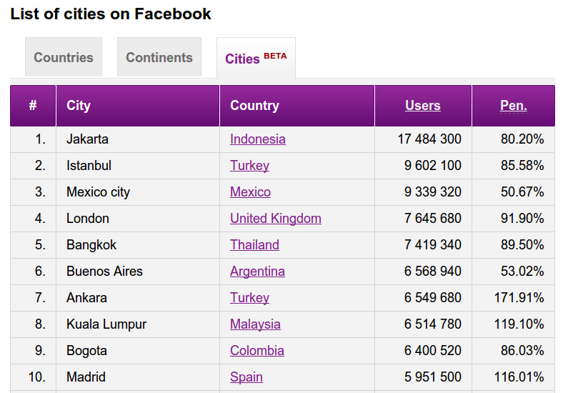 Más o menos la mitad de las personas que vivien en la Ciudad de México usan facebook, que es algo COLOSAL. Pero me parece que hay algo raro con los números, porque… bueno, según Wikipedia, Jakarta tiene una población de más o menos 9 millones de habitantes. O sea que cada habitante de la Ciudad tiene al menos DOS CUENTAS de facebook, lo que sería mucho más COLOSAL.