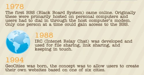 Esta infografía muestra algunos de los pasos en la evolución de las herramientas que usamos hoy en dia. Ver las fechas en las que surgieron nos da idea del proceso de evolución que Internet ha sufrido en los últimos 20 años.