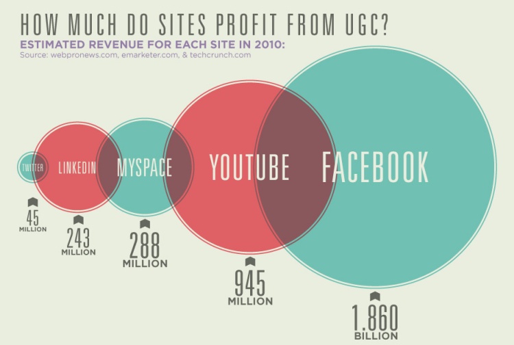 Nada ejemplifica esto mejor que lo que sucede con el Contenido Generado por Usuarios (UGC en inglés). Con esto me refiero a todas las actualizaciones, fotos, enlaces, videos, etc. que compartimos diariamente. Eso es lo que todos estos sitios usan para obtener sus ganancias. Porque habría que preguntarse: