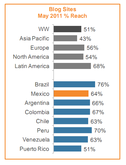 - Los blogs se mantienen como una categoría fuerte y una fuente cada vez mas solicitada de noticias e información. Noten la comparación con el promedio global y en otras regiones.