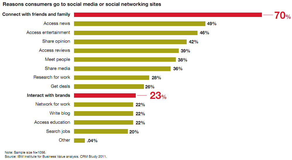 El problema es que hoy en dia las compañías y organizaciones tienen el difícil trabajo de poder lograr que la gente les presten atención. Por supuesto que una enorme cantidad de personas está empleando estos sitios, pero el lograr obtener su atención lo suficiente es lo complicado. No en balde solo el 23% de las personas expresa que contactar con una marca es razón para usar Medios Sociales.