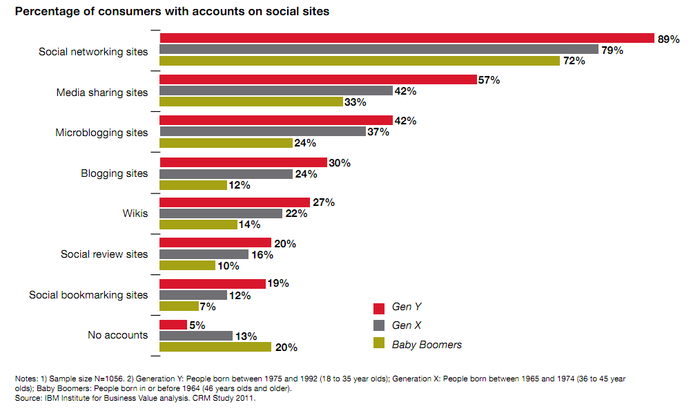 No es noticia el que cada vez mas personas están siendo activas en Internet. La cantidad de usuarios y de contenido en muchos sitios es prueba de esto. Es un lugar común decir que la mayoría de los usuarios son jóvenes y que las generaciones previas apenas se están subiendo al tren de los Medios Sociales. Esto es mayormente cierto, sin embargo un estudio publicado por IBM nos muestra que a pesar de las diferencias en cantidad, el perfil y actividad de los usuarios es extrañamente similar sin importar de que generación hablemos.