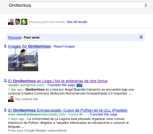 Que ahora Google además de mostrarnos las tradicionales búsquedas que conocemos desde siempre, puede mostrarnos resultados tomados de nuestros contactos y relaciones, principalmente en Google+. Es decir, complementa los resultados «puros» con resultados específicamente tomados de nuestros círculos de contactos. Esto es un cambio que tiene que verse en vivo para entenderse en realidad. Lo he estado probando esta mañana y los resultados me han parecido bastante buenos. Genuinamente hacen una diferencia.