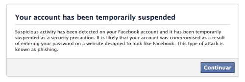 Se ha detectado actividad sospechosa en su cuenta de Facebook y ha sido temporalmente suspendida como una precaución de seguridad. Es probable que su cuenta haya sido vulnerada como resultado de capturar su contraseña en un website diseñado para asemejarse a Facebook. Este tipo de ataque es conocido como Phishing.