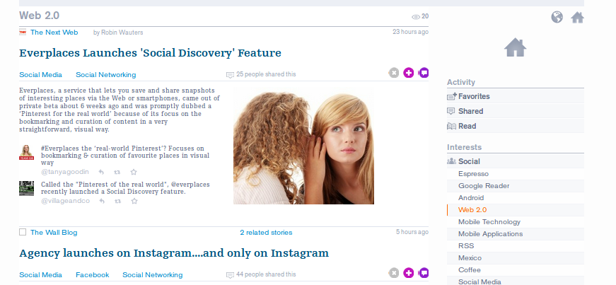 La semana pasada hablamos de como los lectores RSS tradicionales no suelen ayudar mucho en algunos aspectos, particularmente el descubrimiento y las búsquedas temáticas. La visión del «superconsumidor» de información ha dejado su lugar a un lector mas casual y enfocado a ciertos temas, en los que la facilidad de uso, capacidad de descubrimiento y presentación visual son los puntos mas importantes. Esto ha creado una serie de aplicaciones que podríamos describir como «revistas digitales personalizadas», que están logrando lo que los lectores RSS de noticias jamás lograron, es decir, lograr aceptación entre el público en general.