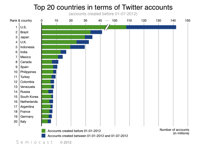 Esto quiere decir que en general podemos asumir que solamente entre una cuarta parte y la mitad de las cuentas que existen en Twitter reciben algo de atención de parte de sus usuarios. Ese numero de 500 millones ya parece mas razonable, lo cual significa que solo hay una población activa entre 125 y 250 millones de cuentas en el mundo. A esto todavía hay que restarle un poco, considerando cuentas automáticas, feeds y aplicaciones, pero comparado con estudios previos nos muestra el crecimiento que está teniendo Twitter en el mundo. En marzo Twitter anunció que había 140 millones de usuarios activos asi que si hacemos cuentas, esto significa que quizá estas cifras están dentro de lo creíble.