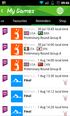 Parte de un grupo de 3 aplicaciones, Results por mucho es la mas práctica y poderosa para los que no estamos en Londres en estos momentos (si están o planean ir London 2012 Join In les vendrá de maravilla). Esta aplicación permite seguir todos los eventos olímpicos y poder personalizar la información que podemos ver con deportes y atletas favoritos, recordatorios de competencias y noticias por pais.