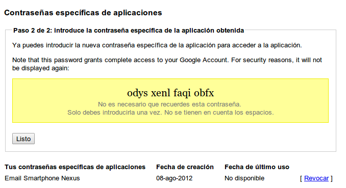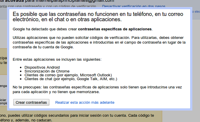 A partir de este momento nuestra cuenta queda protegida contra accesos desde equipos de escritorio y laptops. Pero hay un detalle que es MUY importante: los dispositivos móviles y algunas otras aplicaciones requieren un paso adicional. Seguramente verán el siguiente aviso, asi que no se espanten. Solo hagan click en «Crear contraseñas»