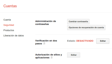 Tras esto pasamos a la sección de Seguridad. Debemos ver algo asi, hay que editar la opción «Verificación de Dos Pasos».