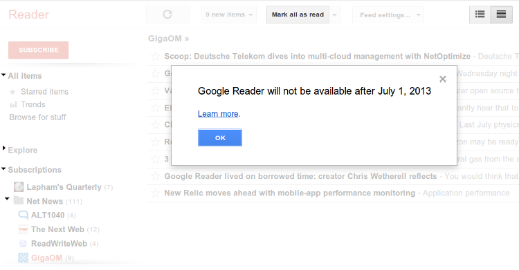 Es una queja que he escuchado mucho desde ayer: Lo único que uso mas que Reader es Gmail. Hay mucha gente sorprendida, enojada y triste. Las redacciones de muchos blogs de tecnología están de luto. Muchos periodistas también lamentan esto. Pero son la minoría. Una minoría influyente e importante en el ecosistema de la información en web, pero a final de cuentas una minoría.