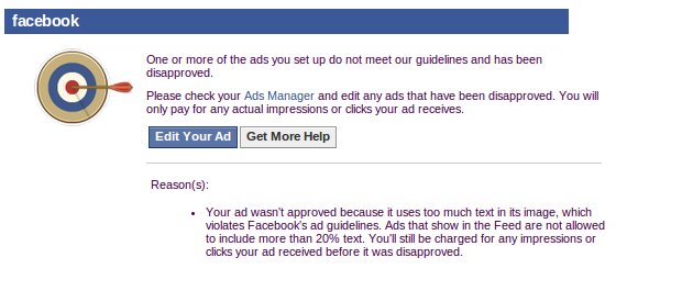 Ya hemos hablado de la publicidad en Facebook más de una vez aqui. Pero no hemos entrado a los detalles de lo que implica hacerla. Y vaya que hay muchos detalles a considerar. Un anuncio bien hecho cuida y toma en cuenta esos detalles aparentemente triviales. Sin embargo hay uno, probablemente el más notorio y molesto, que es el que me interesa tocar hoy. ¿Qué tan molesto es? Cualquier cosa que haga que recibamos un mail de este tipo, horas después de iniciar una campaña que va funcionando bien merece ser llamado al menos molesto, si nos queremos ver amables.
