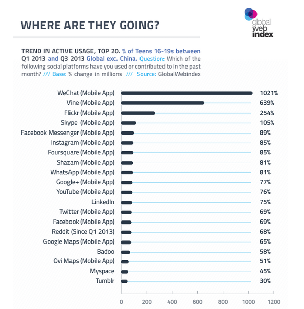 Detalle interesante, CASI TODAS son aplicaciones móviles, lo cuál no me hace sentido del todo. Yo sé que cada vez más adolescentes usan smartphones pero estos números son enormes. El que la encuesta solo incluya usuarios de 16-19 años es significativo para esto. Noten también que la estadística nada más indica si se ha usado en el mes pasado. Y ojo porque WeChat es una aplicación china, esencialmente desconocida en Occidente, de manera que saber si ese índice de crecimiento es genuino o está limitado a quienes mantienen contacto con usuarios chinos es difícil de saber.