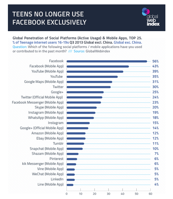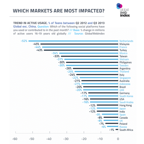 Primero que nada, efectivamente los adolescentes están usando menos Facebook, de eso no hay duda. Y esto no solo pasa en EUA, sino también en el mundo. En un estudio publicado por Global Web Index podemos ver con claridad esto. En México, uno de los paises con mayor uso de esta red social la caida es de 34%, lo que nos pone en 5º lugar de los paises que más reducción han tenido. Los primeros tres lugares corresponden a Holanda, Malasia y Francia con 52%, 45% y 44%. Noten que en EUA el porcentaje es de apenas el 16%.