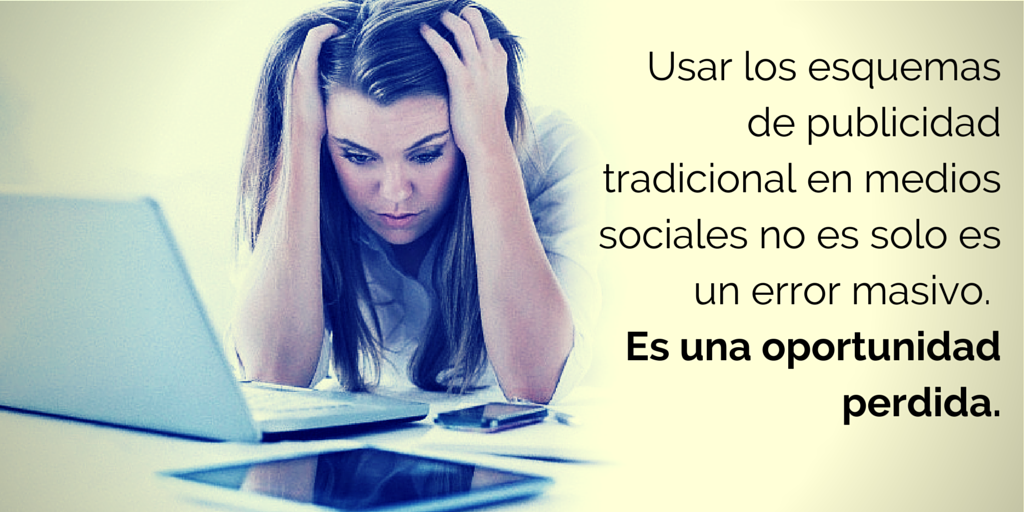Mucha gente cree que los medios sociales operan bajo las mismas reglas de la publicidad en medios tradicionales. Pocos errores son más letales. Incluso la publicidad dentro de los medios sociales (Facebook, Twitter, Linkedin, YouTube, etc.) opera bajo principios que hacen obsoleta la mentalidad de la publicidad tradicional.