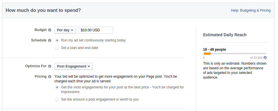 El primer caso es una publicación promocionada común y corriente. Noten que estoy usando criterios de segmentación, que afectan ligeramente el alcance potencial. Noten que el presupuesto es por una semana y el gasto por 10 USD diarios.