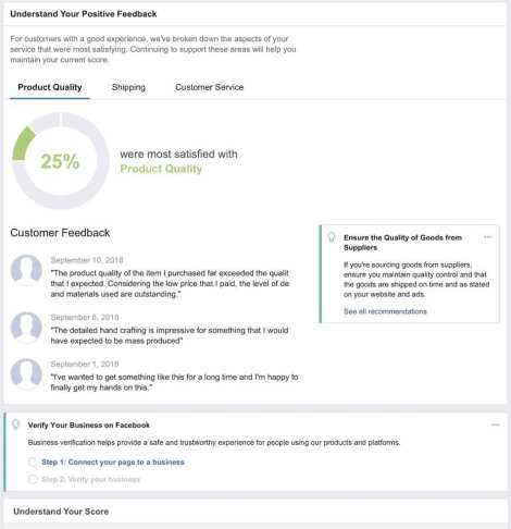 Hay 3 categorías de retroalimentación de clientes: Calidad de producto, Envíos y Servicio a cliente. Quizá Envíos no aplique para todas las marcas, pero definitivamente calidad de producto y servicio a cliente si y eso basta para poder calificar adecuadamente a un negocio, al menos para los propósitos de Facebook.